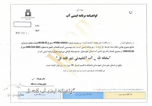 اخذ اولین گواهینامه برنامه ایمنی آب خوزستان برای شهر قلعه تل
