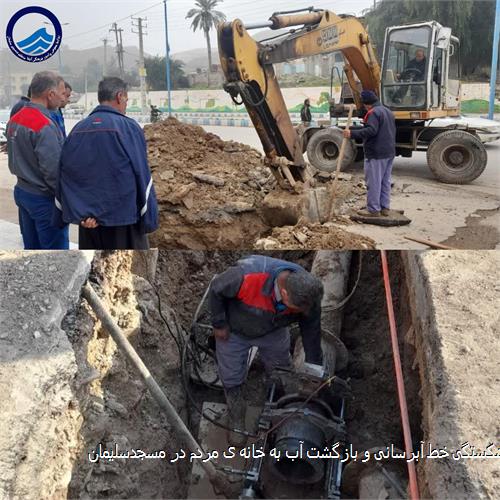 به گزارش روابط عمومی شرکت آب و فاضلاب خوزستان، سرپرست آبفا منطقه مسجدسلیمان گفت: بخشی از خط توزیع آبرسانی در منطقه «ریل وی» جنب پمپ بنزین شهرستان مسجدسلیمان دچار شکستگی و آسیب شد، با حضور و تلاش بیوقفه و چندساعته تیم بهرهبرداری، نقطه آسیبدیده ترمیم و آبرسانی به مشترکان از سر گرفته شد.